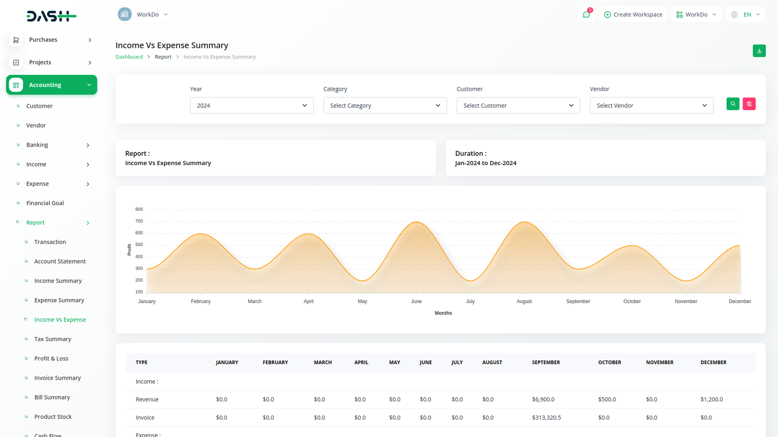 A budget is a financial plan for a specified period to keep in check with the working capital. This feature here helps to maintain the capital flow. You can set monthly, quarterly, half-yearly, or yearly budgets according to your business plans and needs. The main categories are “Income” and “Expense” where one can edit /update /delete the sub-categories as well.